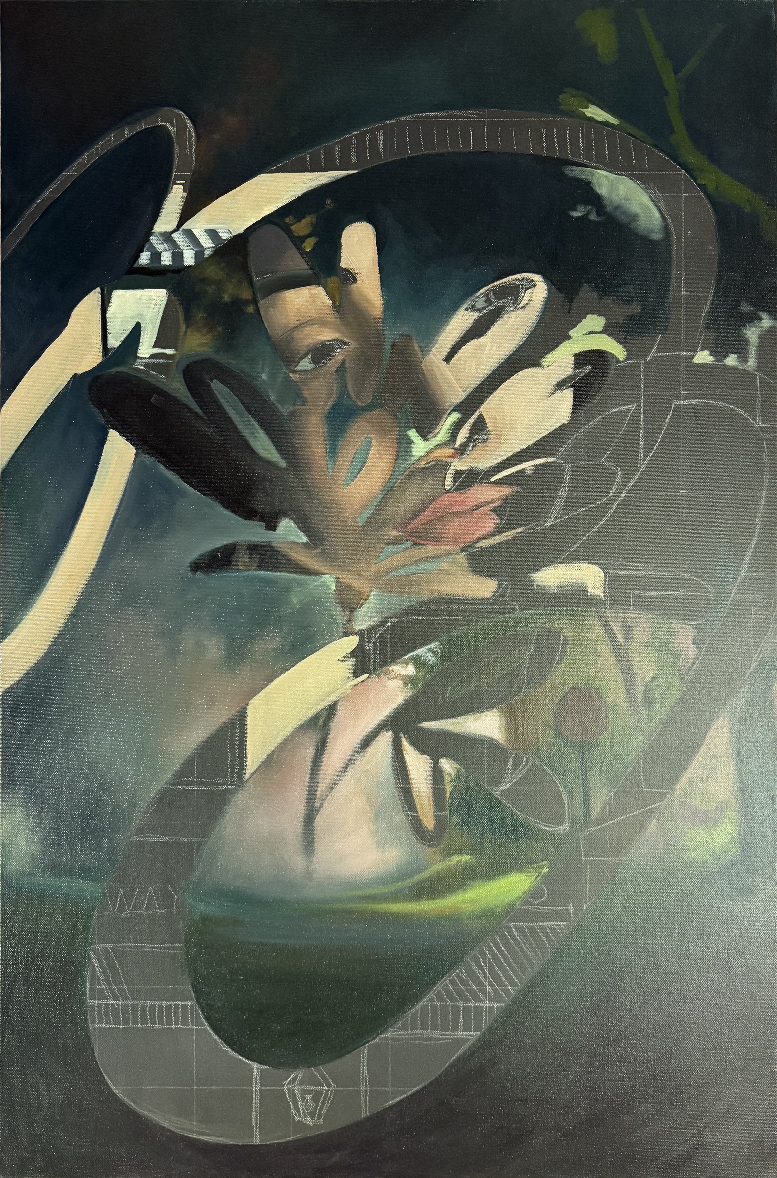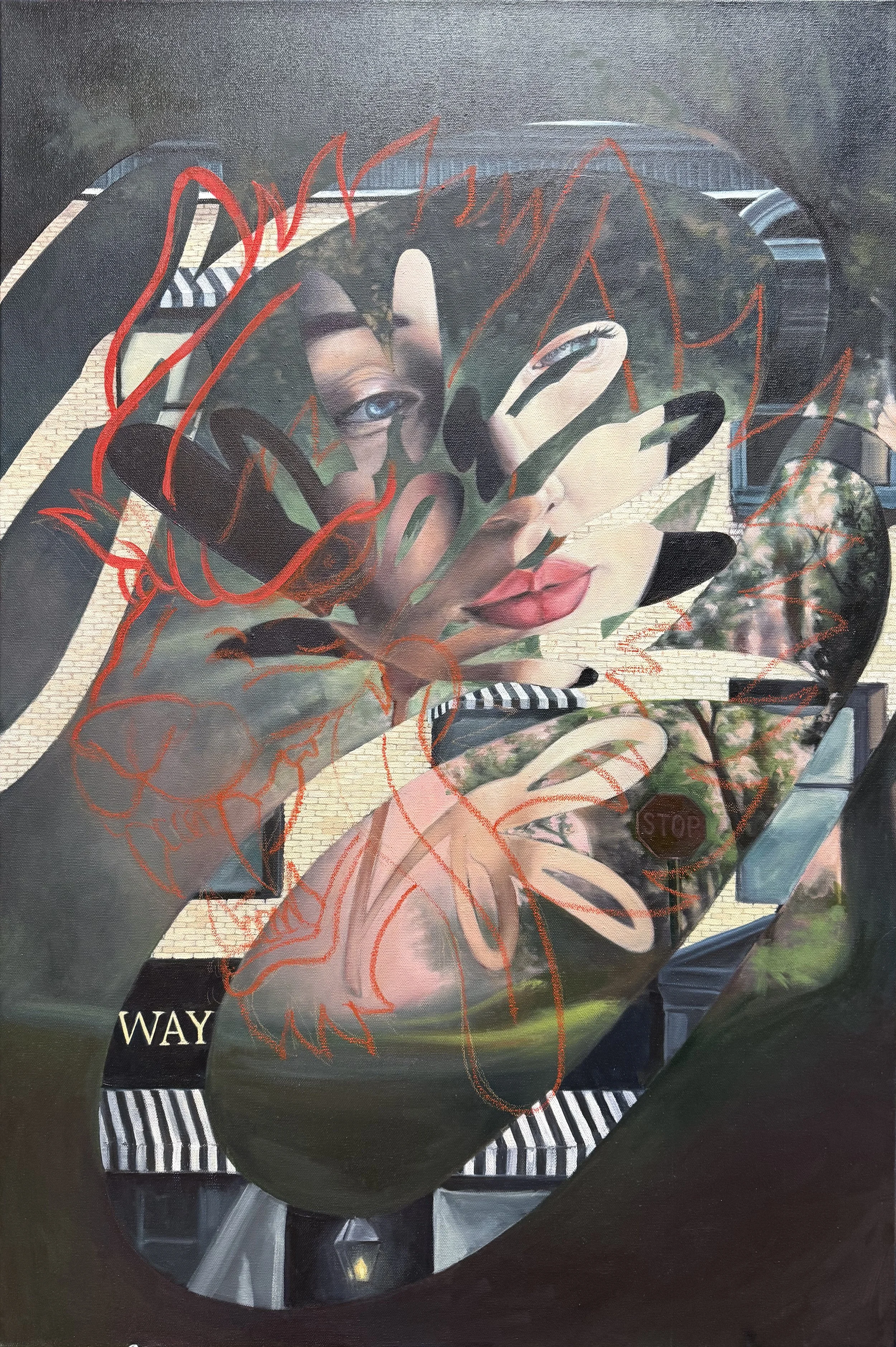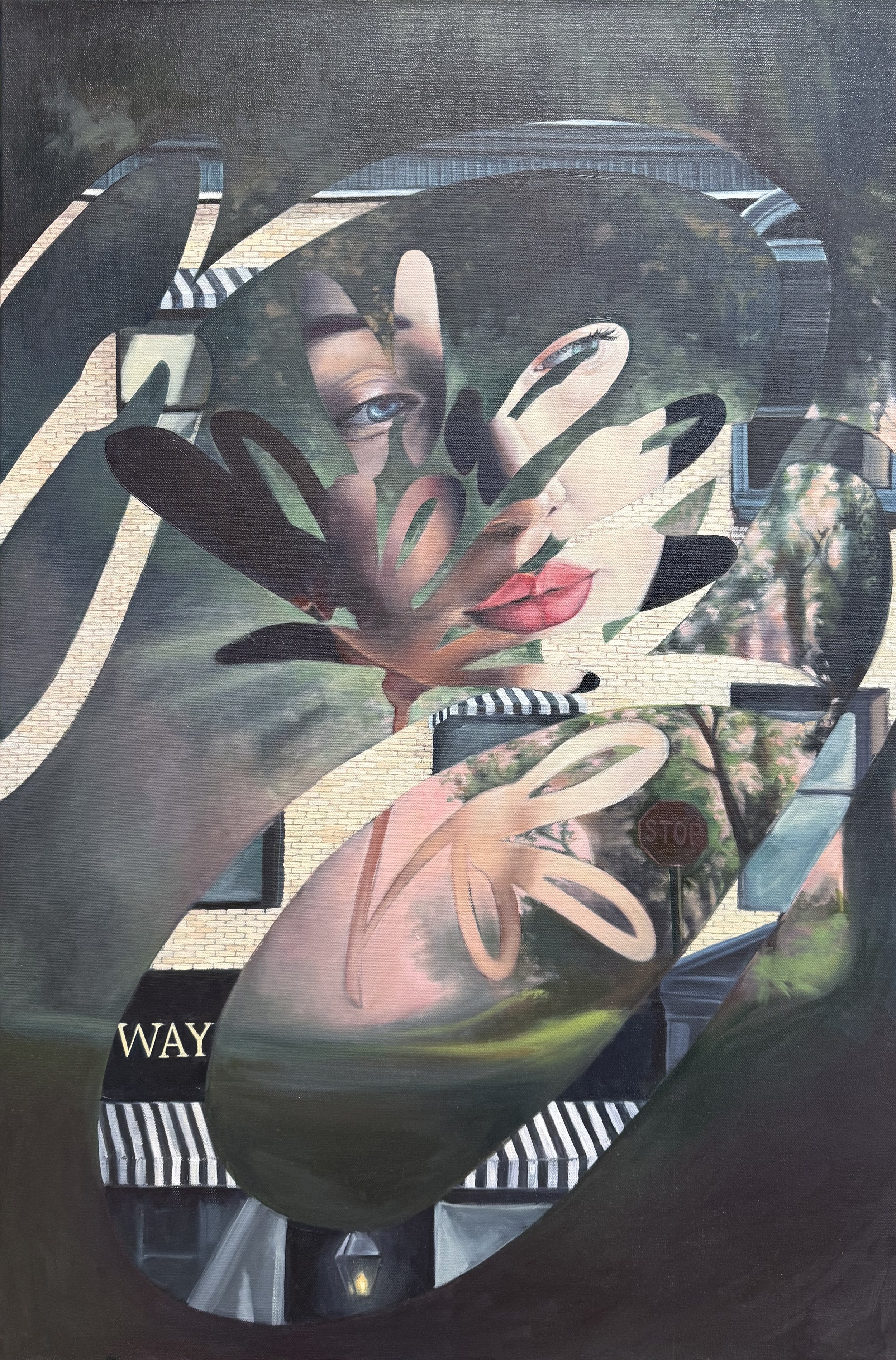 The idea for this painting came to me over a year ago. It was early 2025. A new administration was entering office and it was a time where fear and uncertainty felt like they were becoming normalized in new aspects of life. Things that were once familiar and reliable were becoming scary and unrecognizeable.