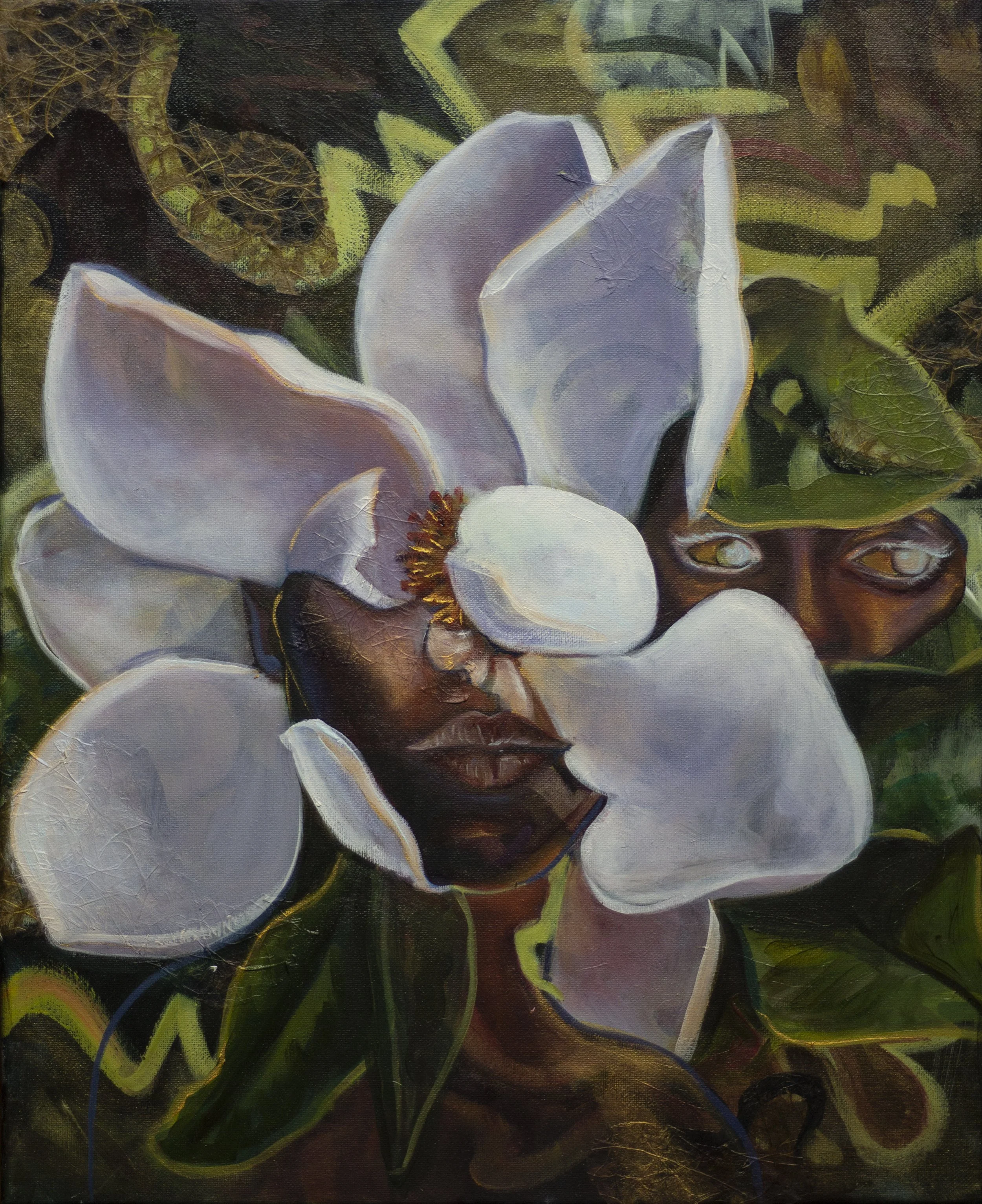 “Magnolia Study,” 16 x 20 inches, Acrylic paint, collage, and oil paint on canvas
